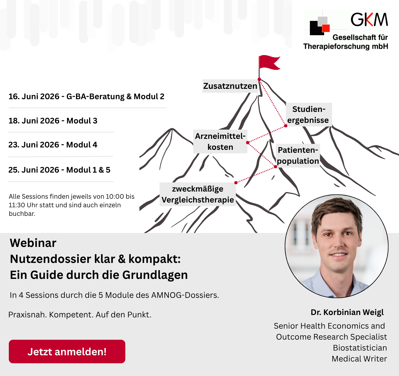 In dieser vierteiligen Webinar-Reihe wird praxisnah dargelegt, wie der Prozess der Erstellung eines Nutzendossiers nach § 35a SGB V abläuft. Es werden Inhalte der einzelnen Prozessschritte erläutert, auf Fallstricke bei der Erstellung hingewiesen und Tipps aus der Praxis gegeben. Zudem werden alle AMNOG-Schritte von der Beratungsanforderung bis zur Stellungnahme besprochen und aufgezeigt, wie ein möglichst reibungsloser Ablauf der Dossiererstellung gewährleistet werden kann. Die Webinar-Reihe richtet sich an alle, die im AMNOG-Bereich tätig werden oder ihre Grundlagen auffrischen wollen.